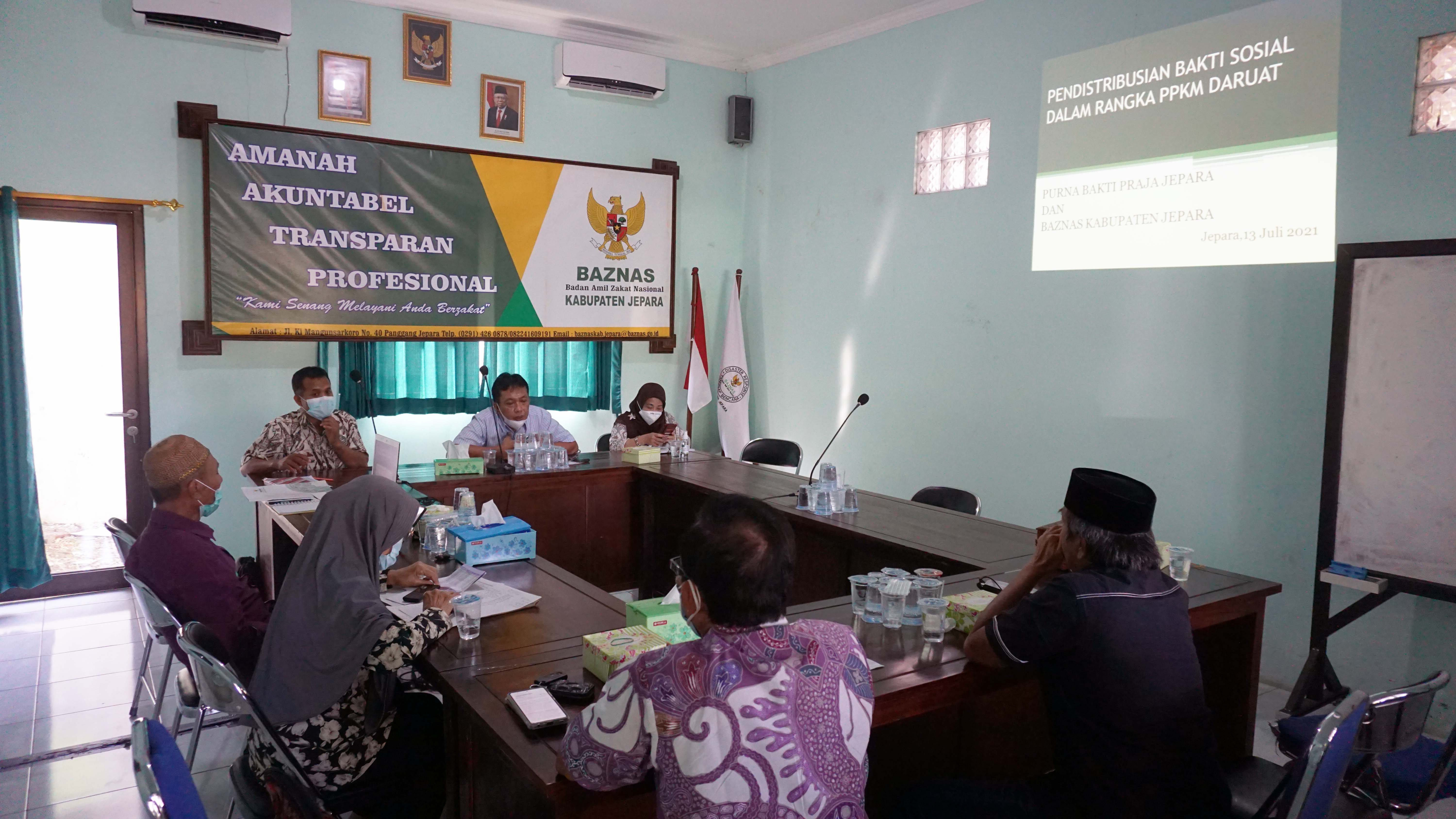 Selasa, 13 Juli 2021 BAZNAS Kabupaten Jepara kedatangan tamu Purna Bakti Praja Jepara guna membahas kegiatan Bakti Sosial. Ini berkaitan tentang dampak PPKM Darurat dimasa Pandemi Covid19 yang mana sangat berdampak bagi sebagian besar masyarakat Indonesia khususnya yang ada di Jepara. Bakti Sosial ini menyasar masyarakat fakir miskin dan pedagang-pedagang kecil di wilayah Kabupaten Jepara dengan pemberian paket sembako sebanyak 500 buah, kegiatan tersebut akan berlangsung pada tanggal 22 Juli 2021.